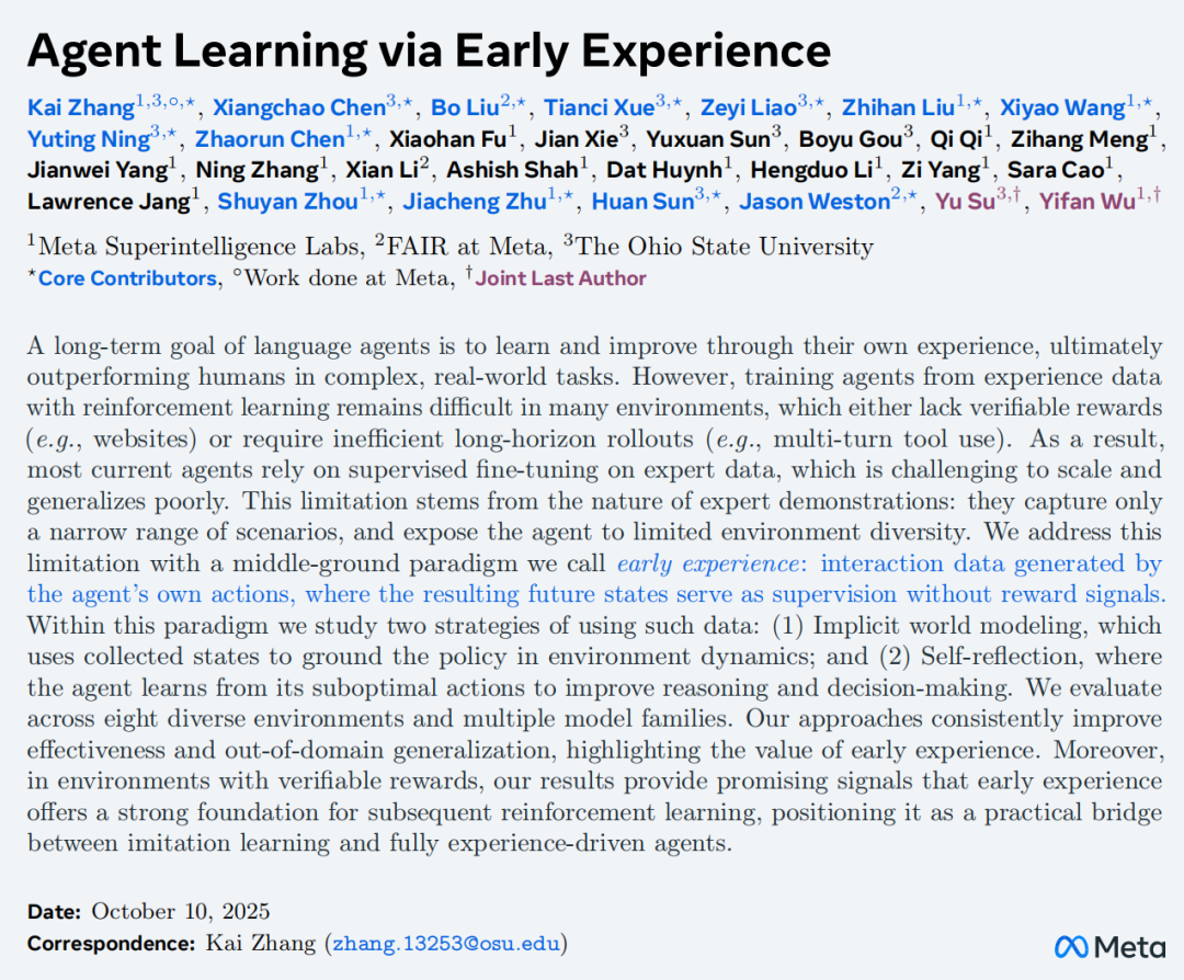 但就在上周,META 超级智能实验室(MSL)、FAIR联合俄亥俄州立大学发了一篇大论文《Agent Learning via Early Experience》,提出了一种被称作「早期经验」(Early Experience)的全新范式,让AI智能体「无师自通」,为突破强化学习瓶颈提供了一种新思路。