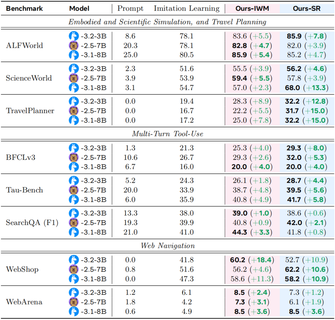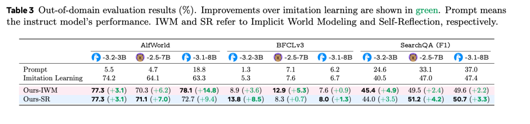 在所有测试环境中,无论采用隐式世界建模还是自我反思,两种方法都取得了一致的提升:任务成功率平均提升了约9.6个百分点,迁移到域外新情境的泛化成功率提升约9.4个百分点。