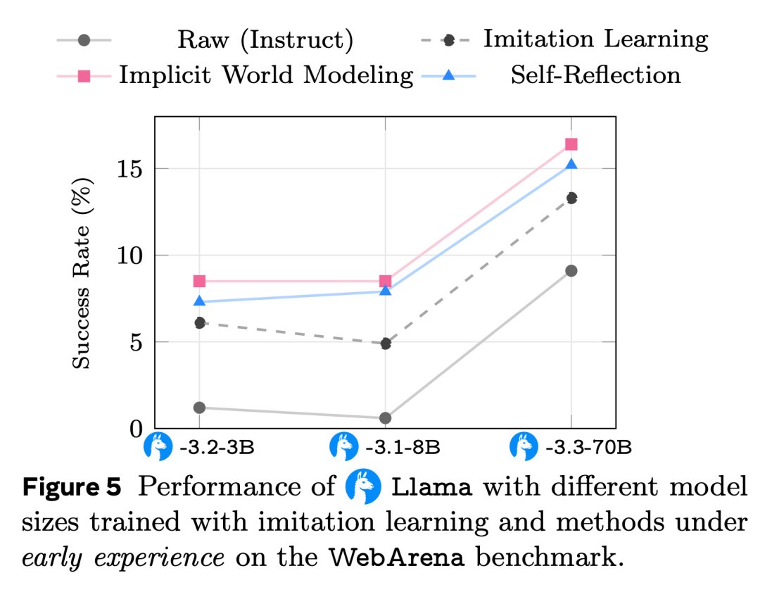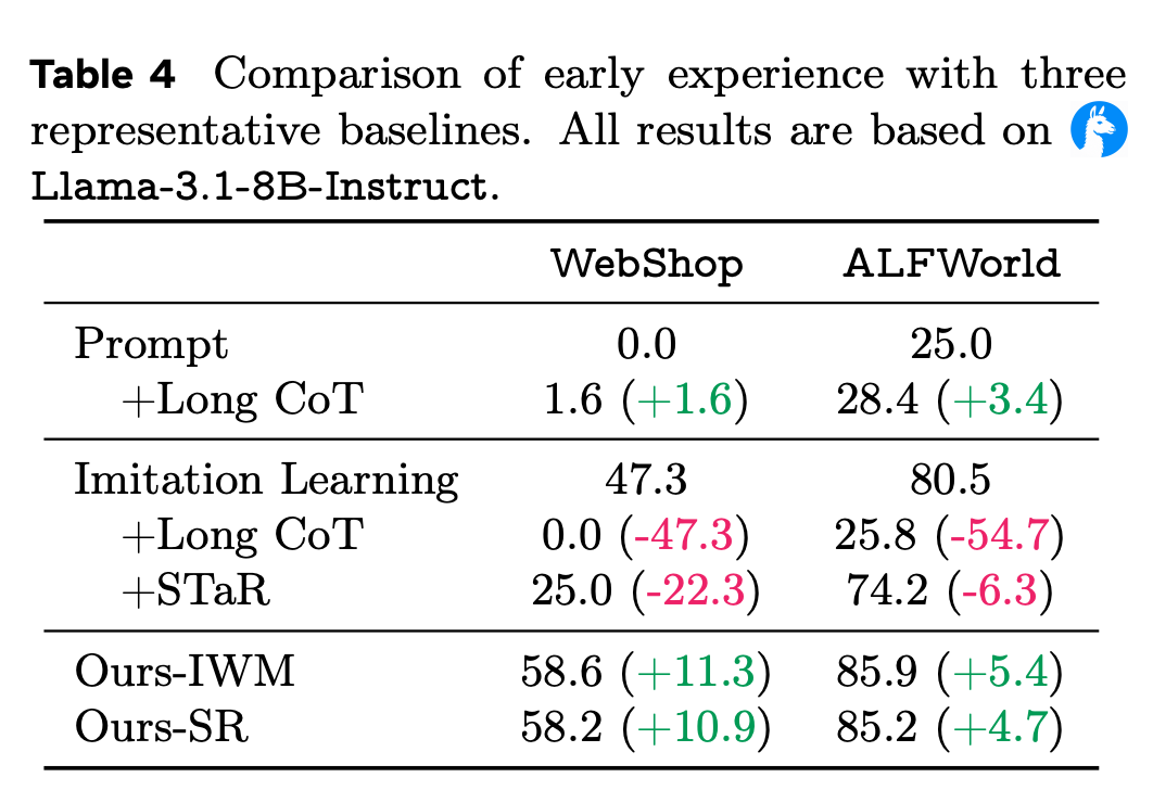 实验结果显示,引入「早期经验」后的智能体表现显著优于纯模仿学习基线。