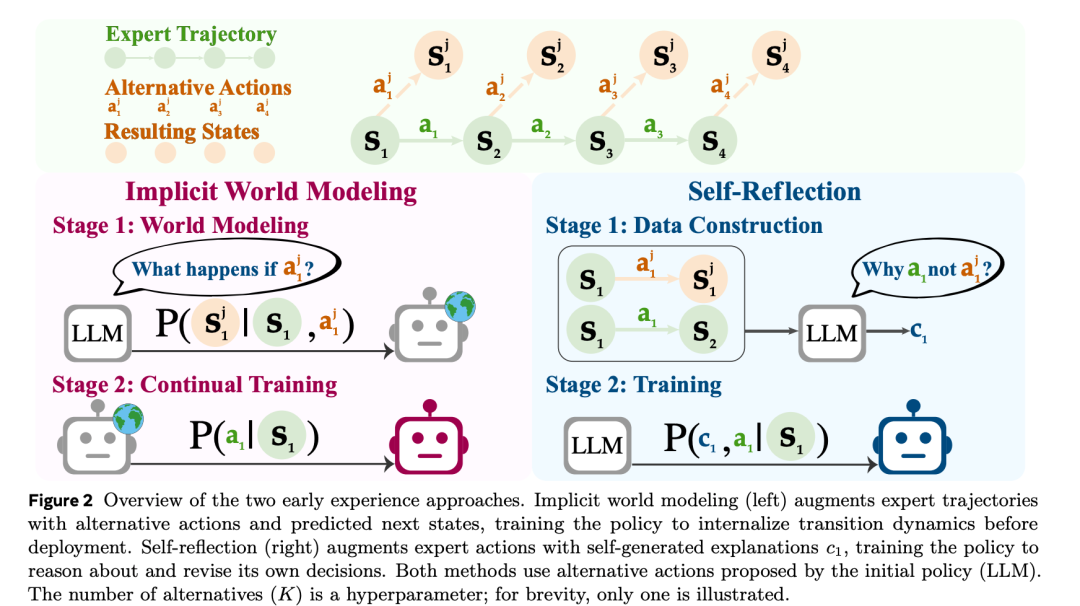 相比之下,早期经验方法中智能体每一次生成的动作和反思都直接基于实际环境反馈:不论是隐式建模获取的状态转移,还是自我反思产生的教训,都源自真实行动的结果,因而信息含量更高、指导性更强。